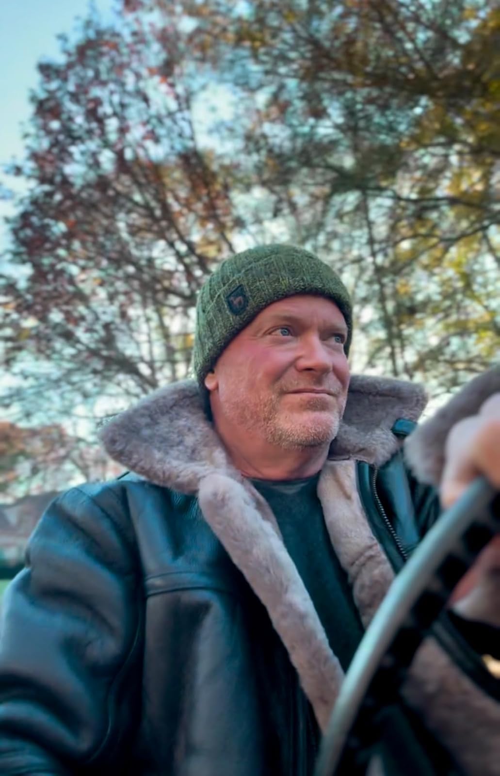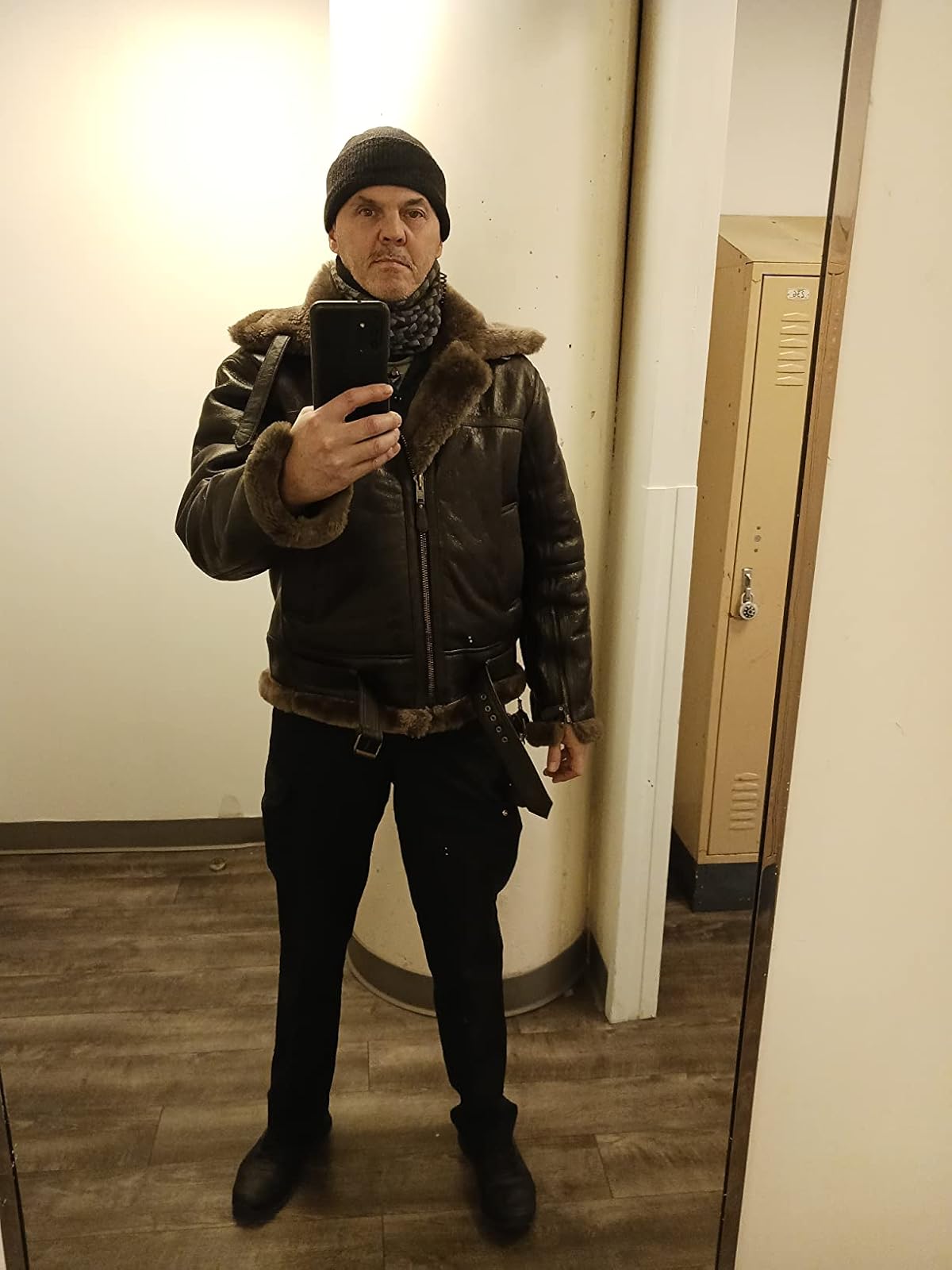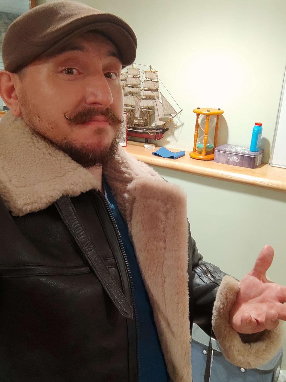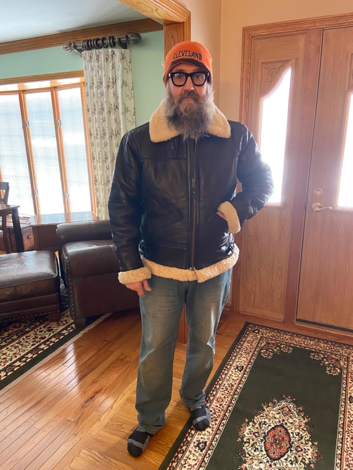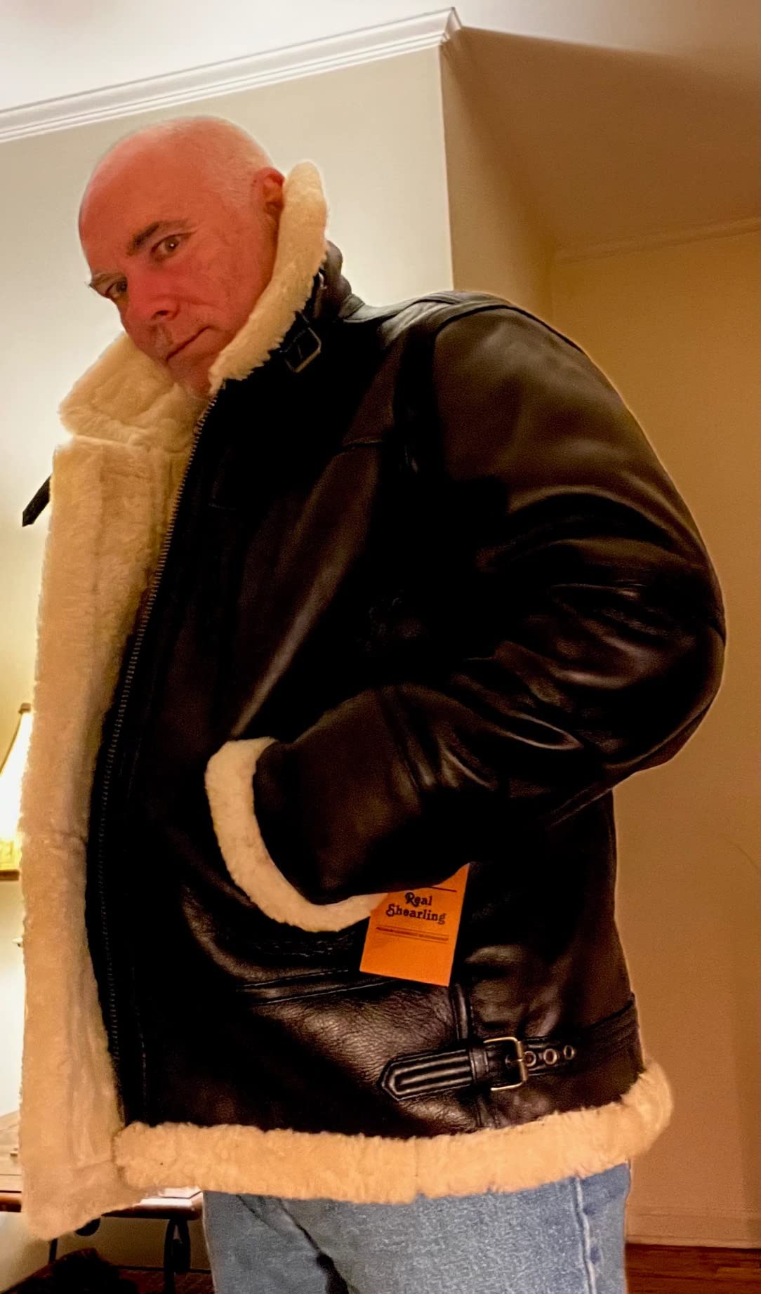 ''Looks exactly as shown in the ad. I’m 5'10" and about 15 stone; the XXL fits perfectly. Classic bomber shape, not tapered. Well made, very warm, real brown leather with ginger shearling. Smells great, solid build, proper quality — nothing fake about it.''