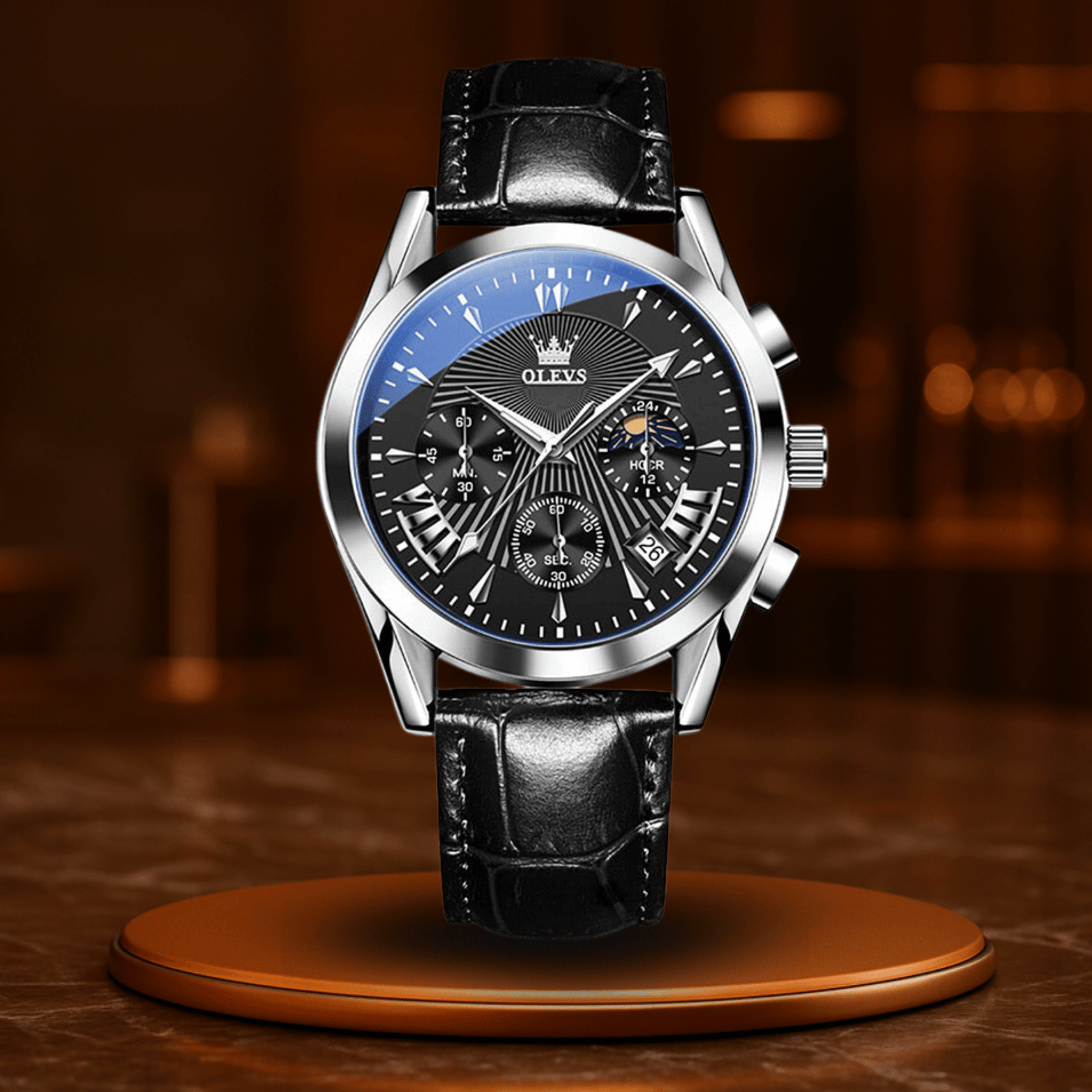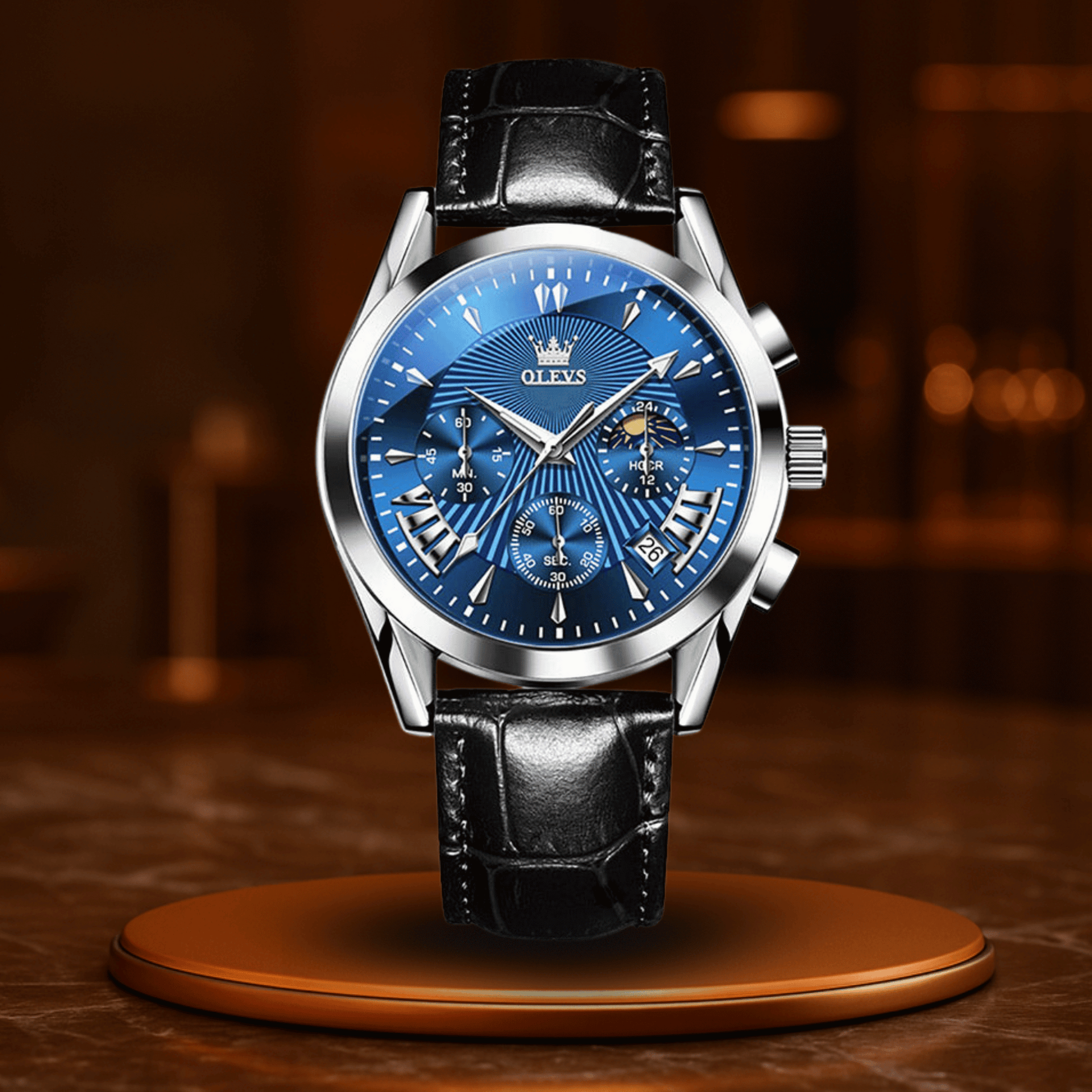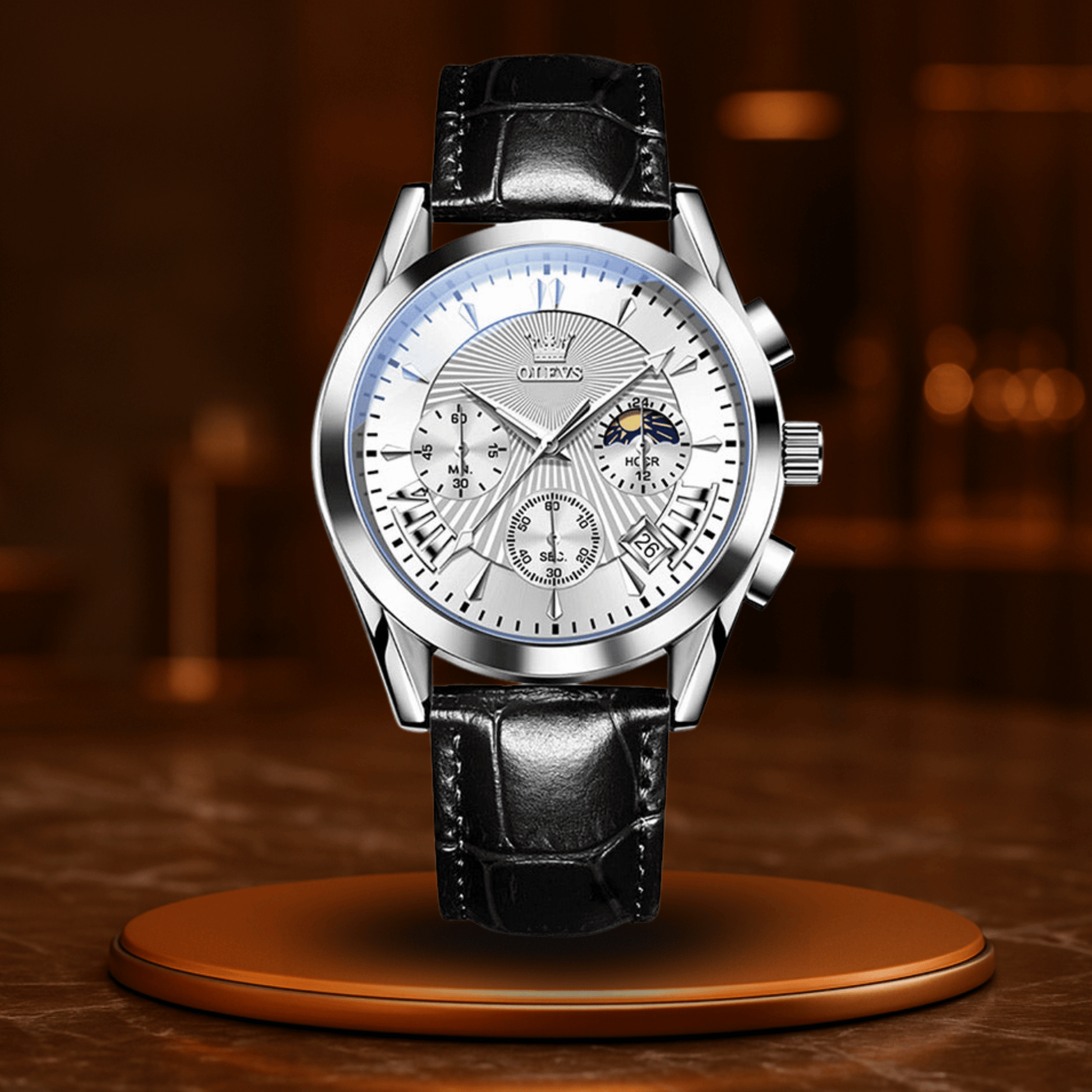 Met zijn elegante leren band, het precieze quartz uurwerk en een reeks functionele complicaties – chronograaf, kalenderfunctie, verlichte wijzers – is het klaar voor alles wat het dagelijks leven biedt. Toch onderscheidt het zich door één enkele, bijzondere eigenschap: de maanfaseweergave. Een venster naar de hemel, ingelijst in roestvrij staal en echt leer.