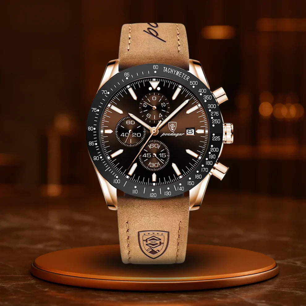 Housed in a robust case, with a genuine leather strap — this watch doesn’t just fit the moment. It shapes it. Whether in the boardroom or by candlelight, it remains quietly present.